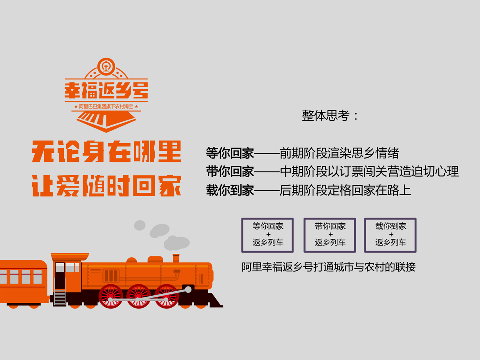 項(xiàng)目背景是在春節(jié)期間,農(nóng)村淘寶聯(lián)合地方政府承包了廣州—貴陽(yáng)、上海—西安的兩趟列車(chē),將漂泊在外的近2000名務(wù)工人員免費(fèi)送回家鄉(xiāng)。接到客戶(hù)相關(guān)需求后,需要在1個(gè)月之內(nèi)做出一系列H5進(jìn)行傳播,面臨挑戰(zhàn)是即要在短時(shí)間想出idea完成項(xiàng)目,也要在傳播上引發(fā)大眾的共鳴。